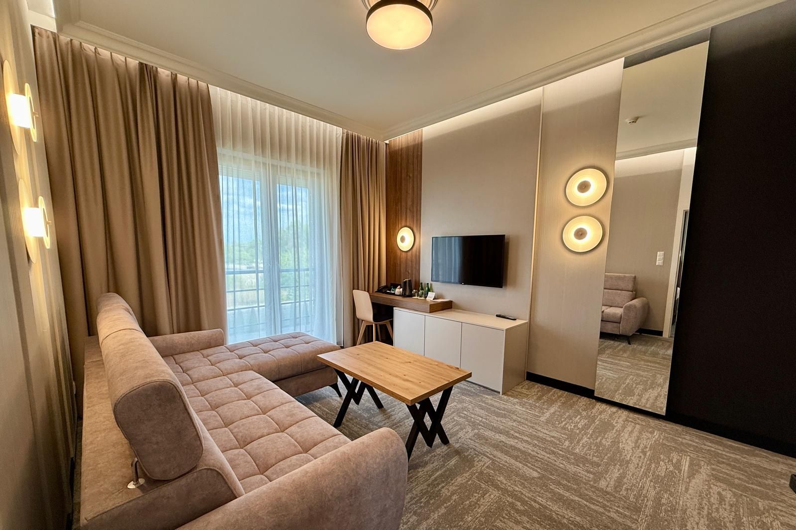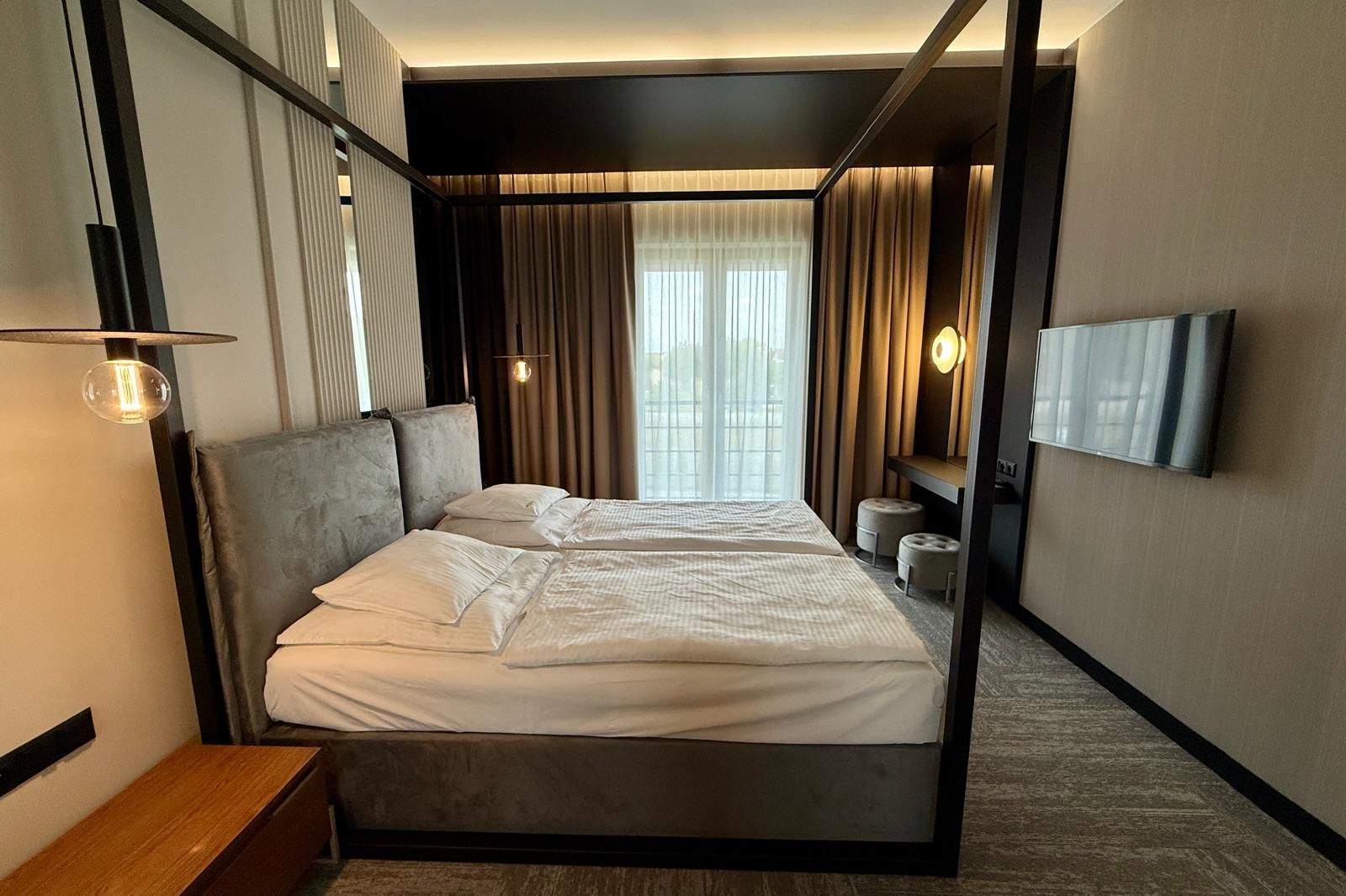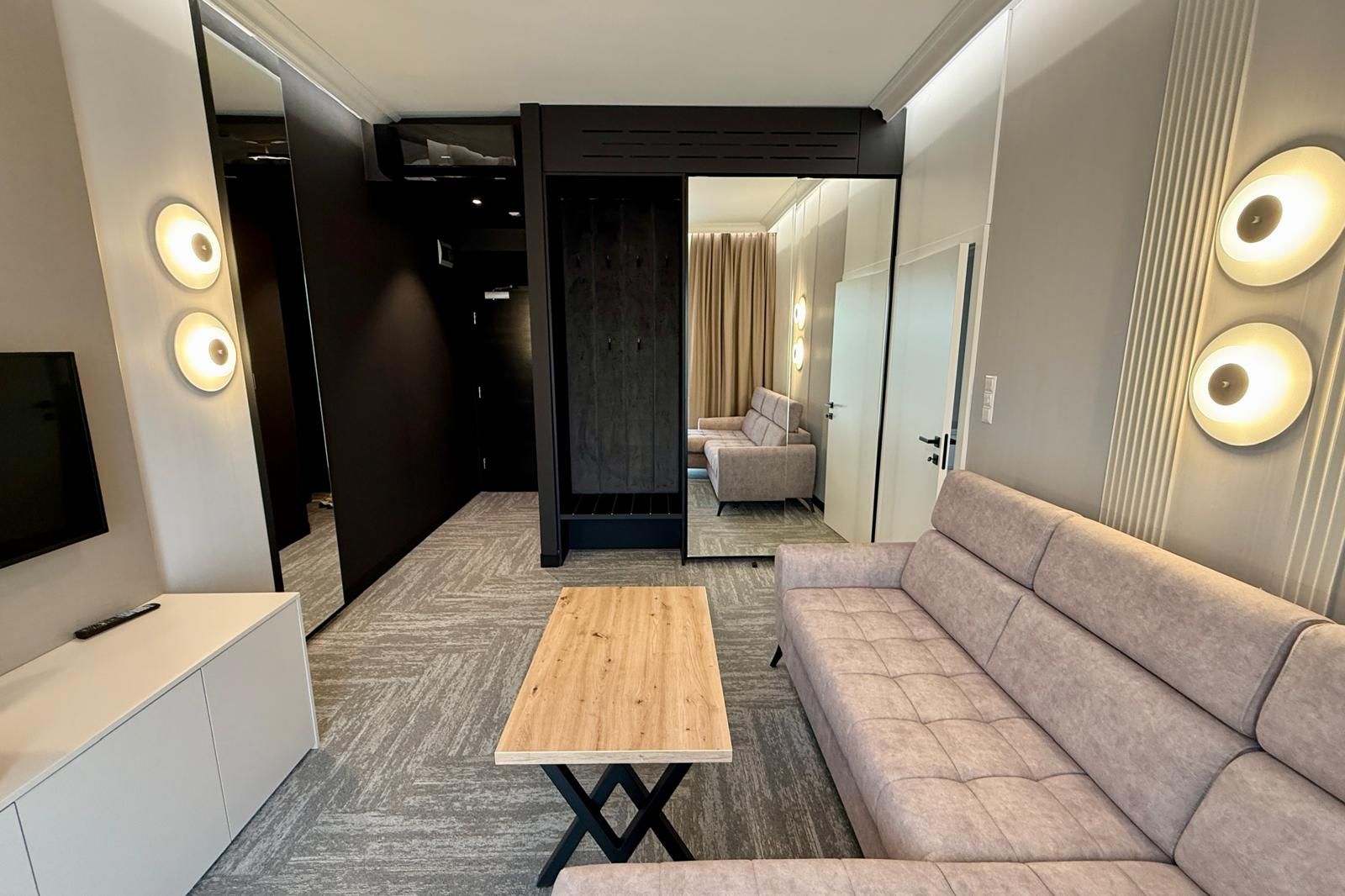 Standardowe wyposażenie każdego Apartamentu obejmuje: sypialnia w którym znajduje się 1 duże podwójne łóżko, TV 32”, pokój dzienny w którym jest możliwość przygotowania 2 dodatkowych łóżek, znajduje się tutaj TV 40”, łazienka z wanną i kabiną prysznicową, toaleta. W pokoju dziennym znajduje się również biurko do wygodnej pracy.