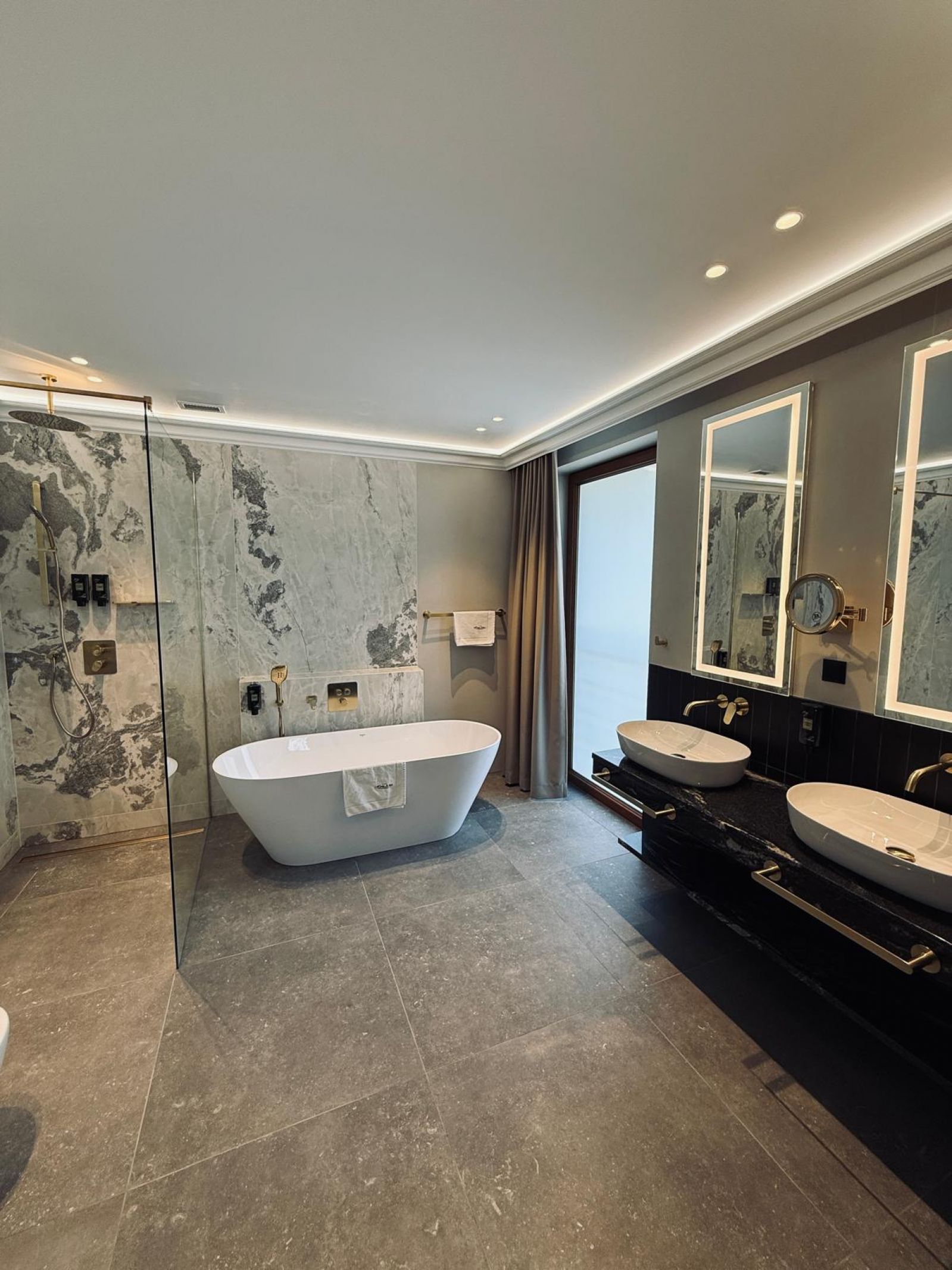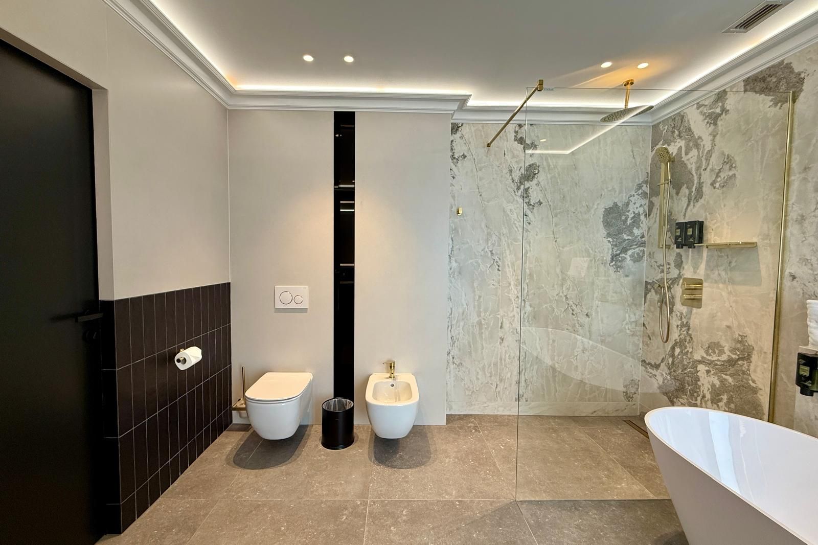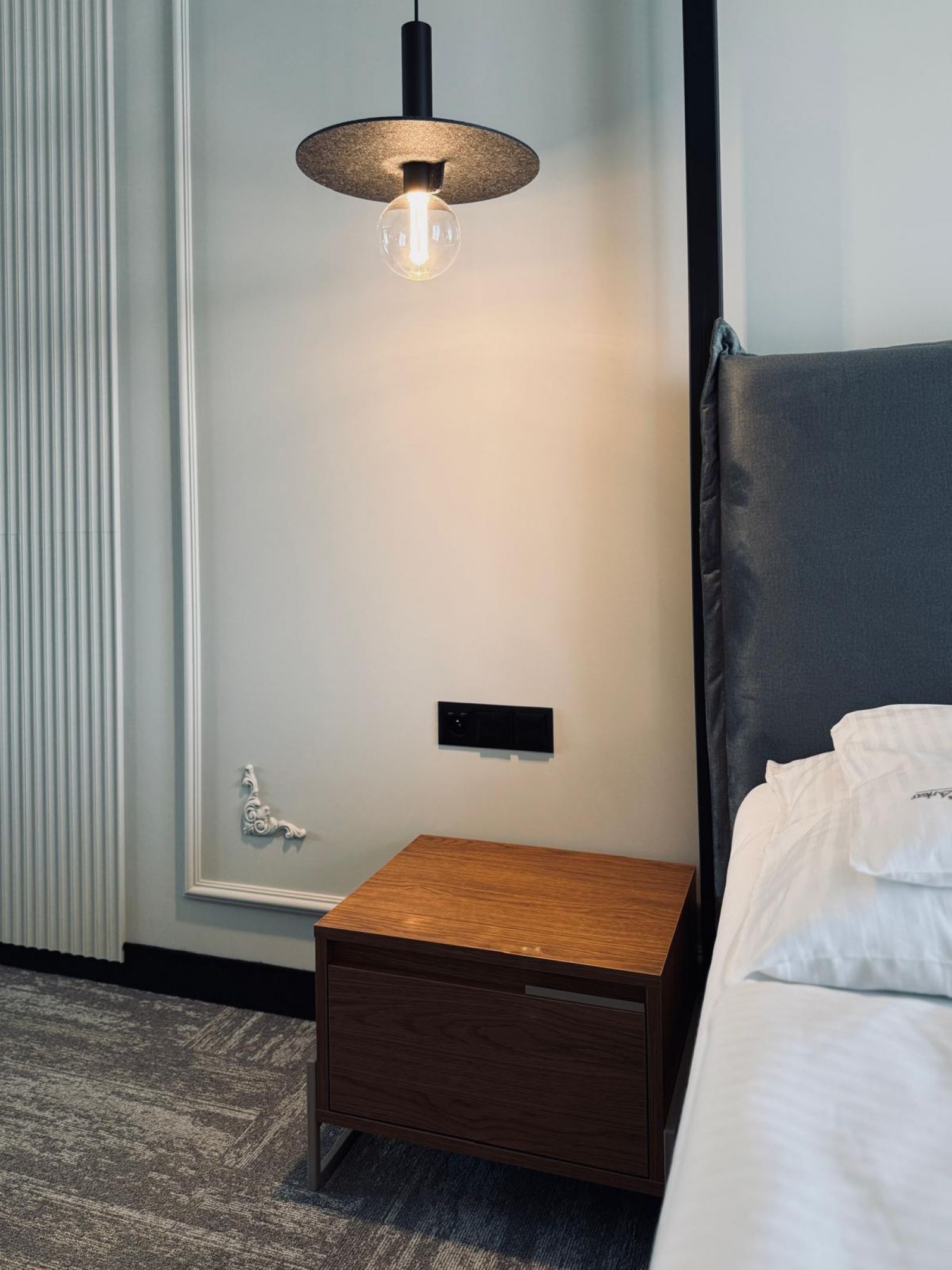 Standardowe wyposażenie każdego Apartamentu obejmuje: sypialnia w którym znajduje się 1 duże podwójne łóżko, TV 32”, pokój dzienny w którym jest możliwość przygotowania 2 dodatkowych łóżek, znajduje się tutaj TV 40”, łazienka z wanną i kabiną prysznicową, toaleta. W pokoju dziennym znajduje się również biurko do wygodnej pracy.